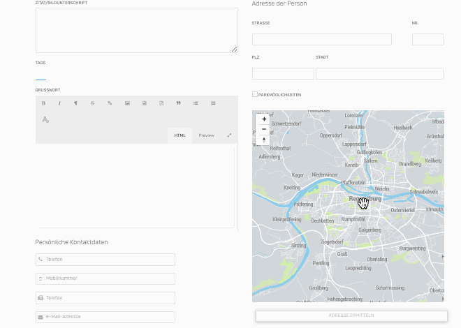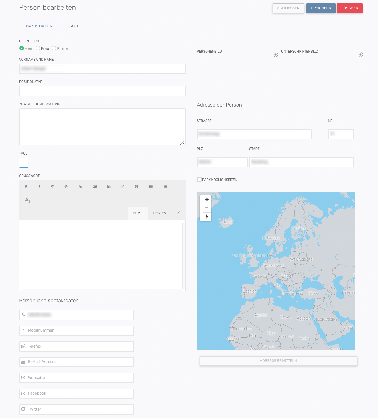 Ein Personeneintrag hat eine Anrede, Namen, Position/Typ, Zitat/Bildunterschrift, Tags, Personenbild, Unterschriftenbild, Anschrift, Persönliche Kontaktdaten sowie ein kurzes Grusswort.