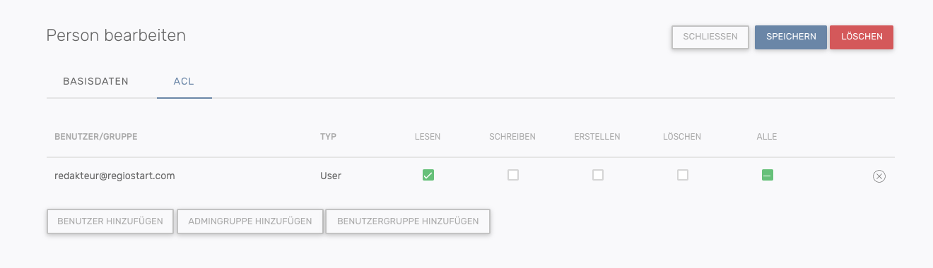 Zugriffsrechte des Eintrags können unter dem Reiter ACL verwaltet werden. Durch klicken des jeweiligen -Buttons können einzelne Benutzer, Benutzergruppen oder Admingruppen hinzugefügt werden.