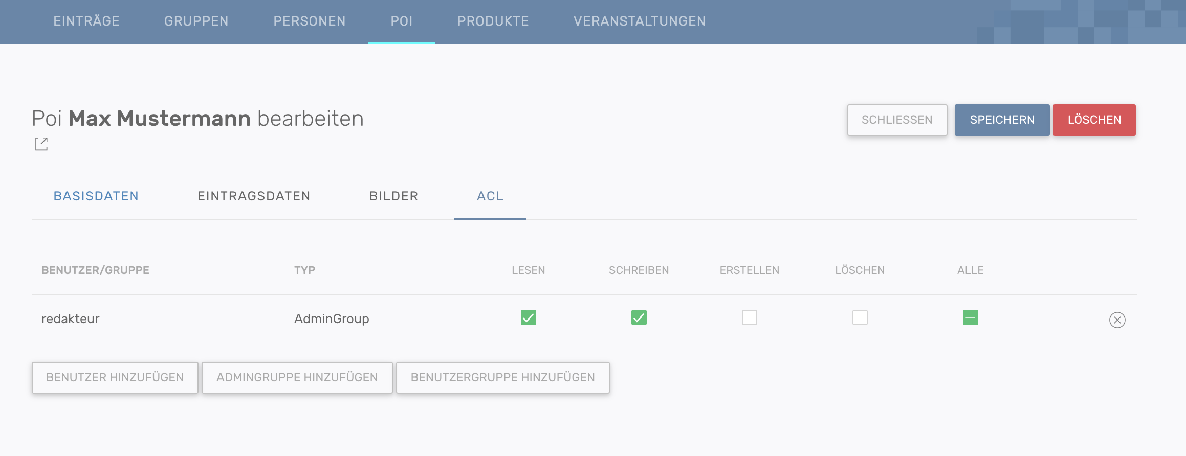 Zugriffsrechte des Eintrags können unter dem Reiter ACL verwaltet werden. Durch klicken des jeweiligen -Buttons können einzelne Benutzer, Benutzergruppen oder Admingruppen hinzugefügt werden.