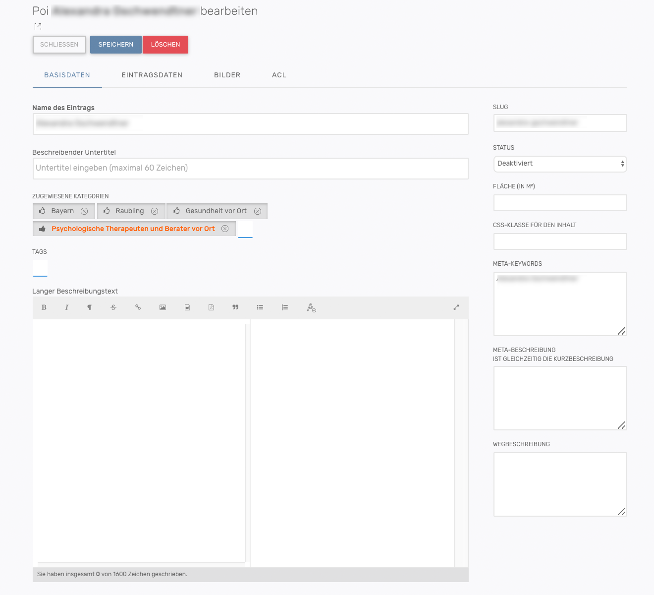 Ein POI-Eintrag hat die Basisdaten: Namen, Untertitel, Kategorien, Tags, Beschreibung, Slug, Veröffentlichungsstatus, Fläche, CSS-Klasse, Meta-Keywords, Meta-Beschreibung und eine Wegbeschreibung.