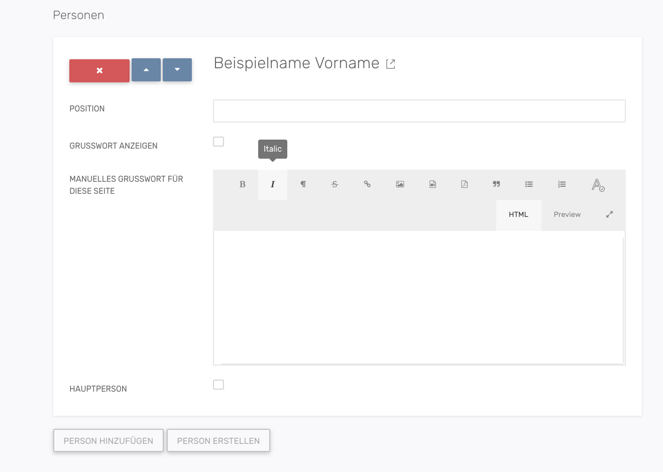 Ist dem POI eine Person zugewiesen kann dieser eine Position zugewiesen werden. Über die Option Grusswort Anzeigen kann ein Manuell für diese Seite erstelltes Grusswort angezeigt werden. Mit der Schaltfläche Hauptperson kann die Hauptperson eines POIs festgelegt werden.