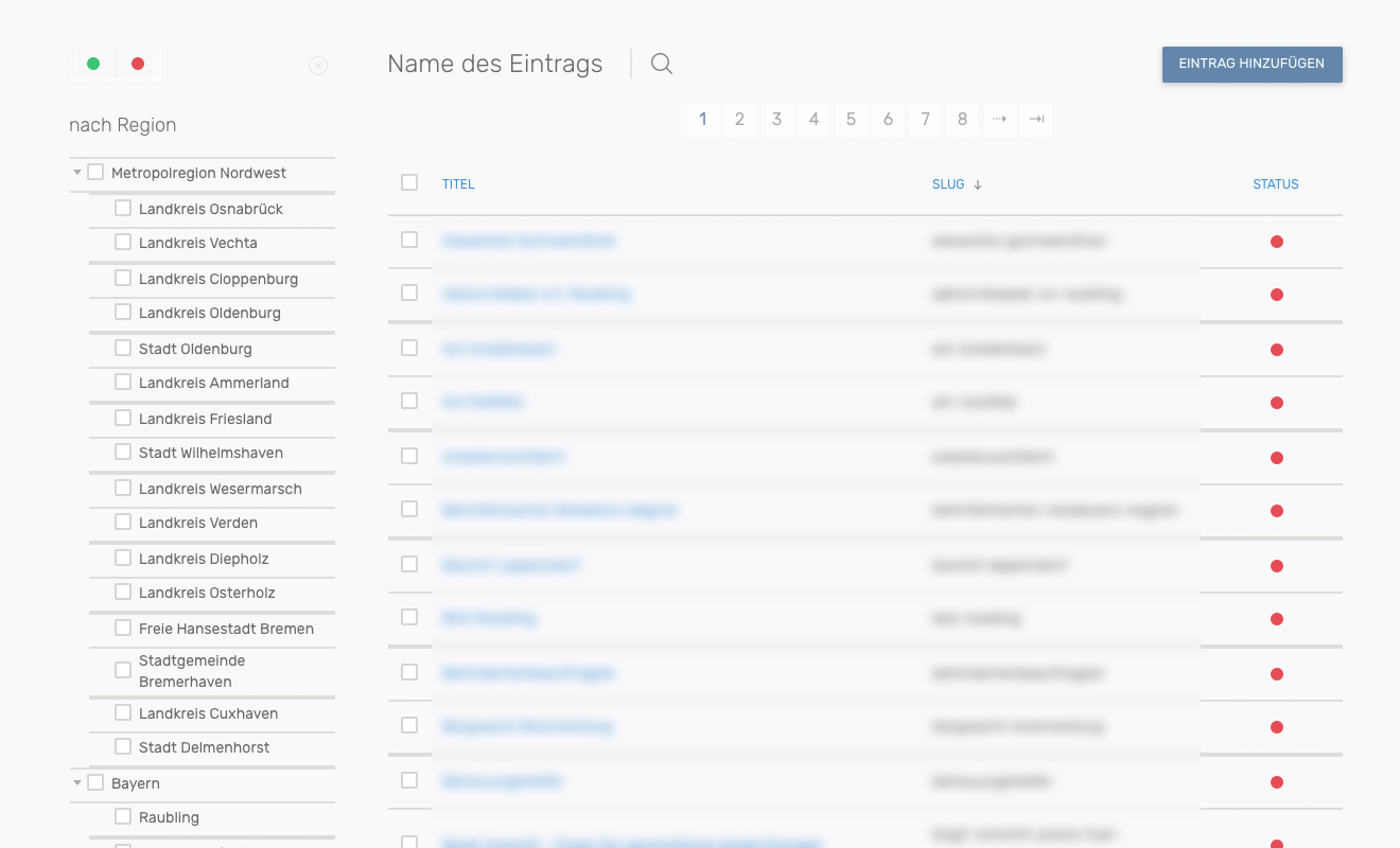 Die POI Ansicht zeigt einen Überblick über alle eingetragenen POIs. Es bietet sich hier die Möglichkeit nach POIs zu suchen (), Sie nach Region und Veröffentlichung zu filtern und auch POIs hinzuzufügen, zu entfernen, zu duplizieren, zu veröffentlichen oder die Veröffentlichung rückgängig zu machen.
