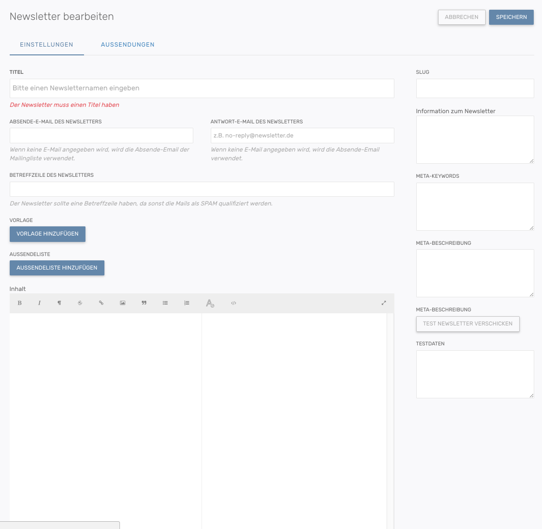 Um einen neuen Newsletter anzulegen klicken Sie auf . Es öffnet sich folgende Eingabemaske: