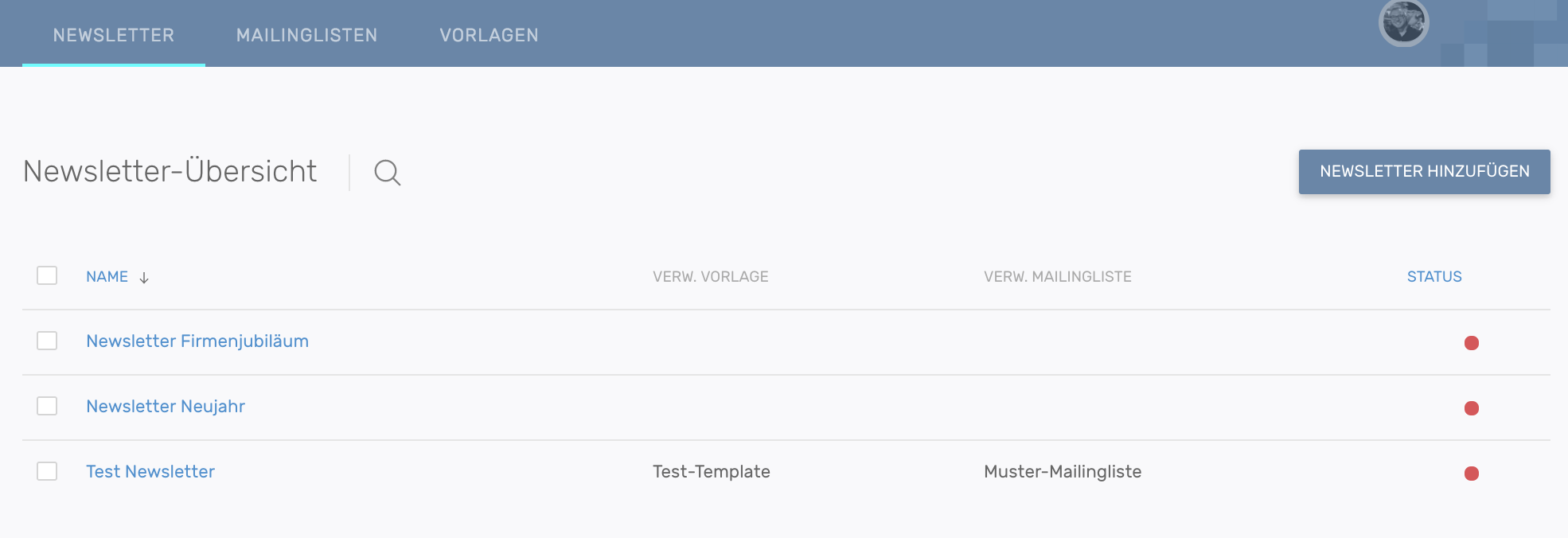Beim Aufruf von Mailing wird eine Liste aller erstellten Newsletter angezeigt.