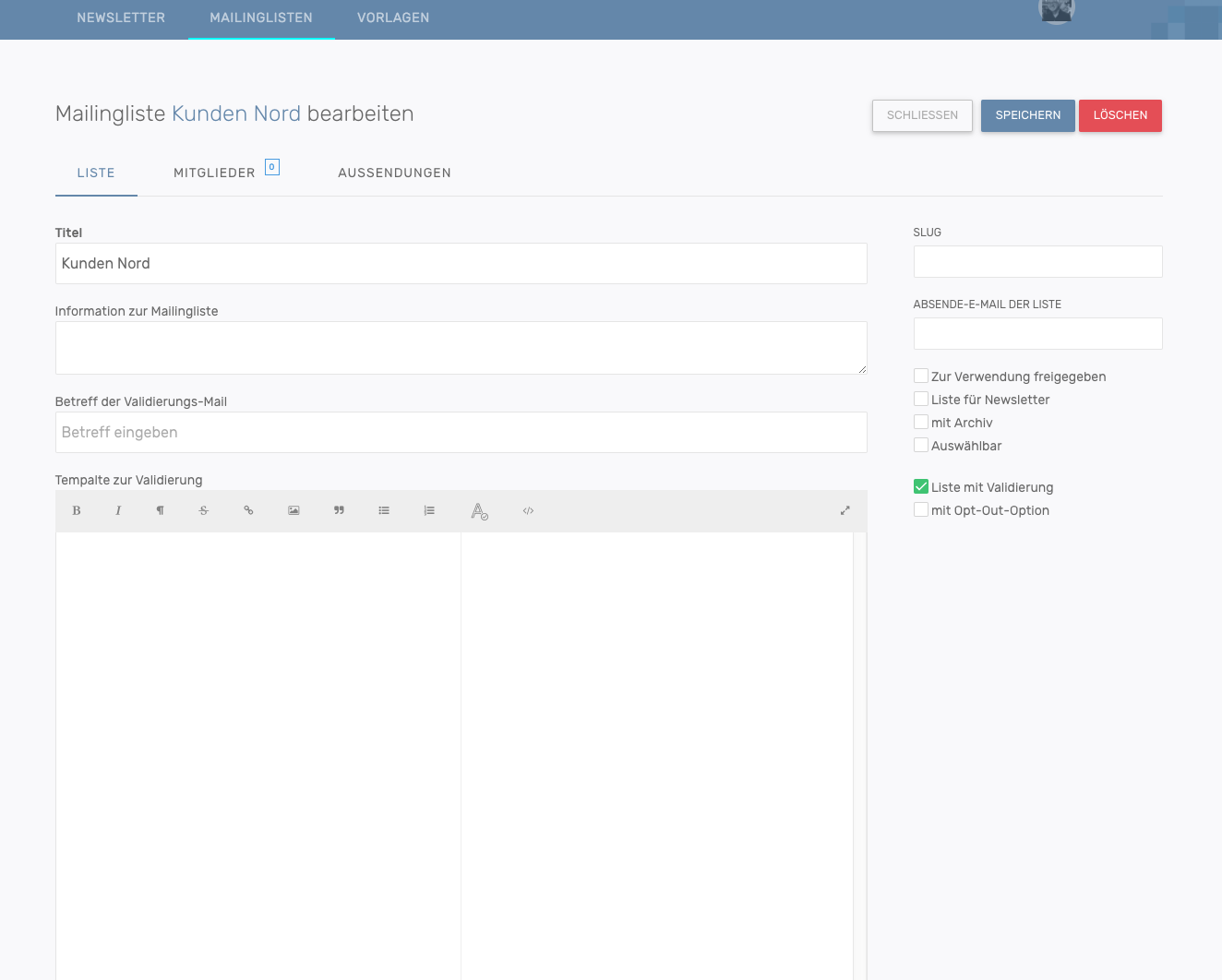Soll der Newletter einen Validierungs-Link beinhalten, um die E-Mail-Adresse des Abonnenten zu überprüfen, setzen Sie die Checkbox bei Liste mit Validierung. Sobald Sie diese Checkbox angewählt haben, erscheint ein Eingabefeld, in dem der Text und die Betreffzeile für die Validierung eingegeben werden kann.