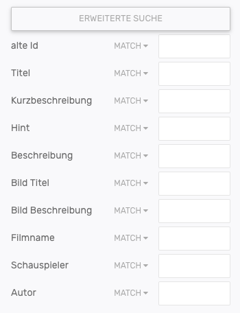 Für jedes Suchfeld können individuelle Übereinstimmungskriterien festgelegt werden. Zur Auswahl stehen das voreingstellte MATCH, sowie die weiteren Optionen matchPhrase und matchPhrasePrefix.