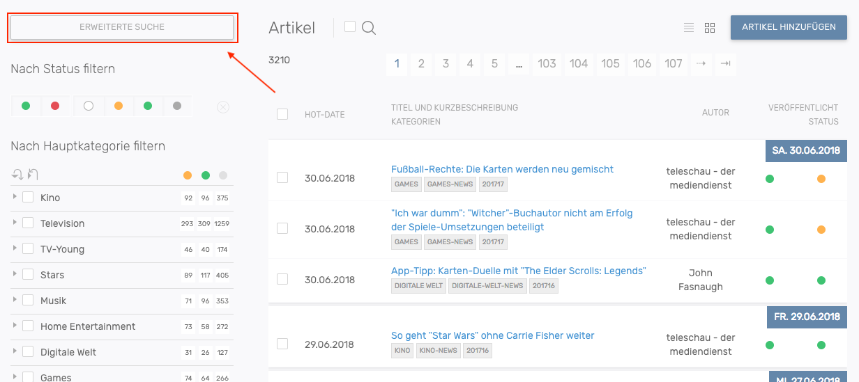 • In der ersten Reihe die Filter nach Veröffentlichungs- und Bearbeitungs-Status