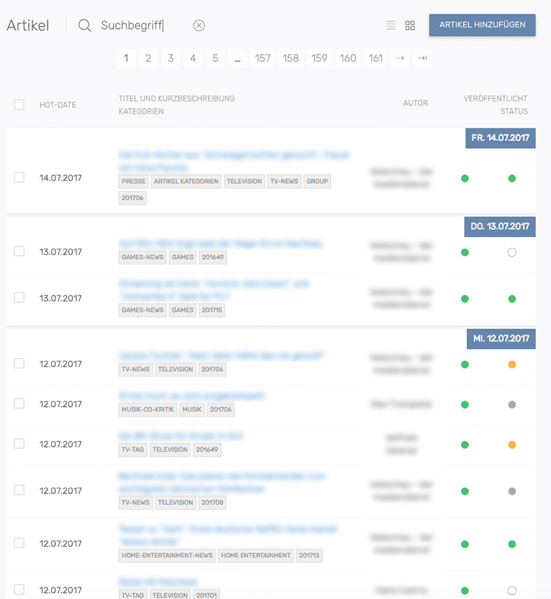 Der Veröffentlichungs-Status der Artikel kann direkt in der Liste gesetzt werden. Ein Klick auf veröffentlicht den Artikel sofort. Ein erneuter Klick setzt den Artikel wieder auf unveröffentlicht.