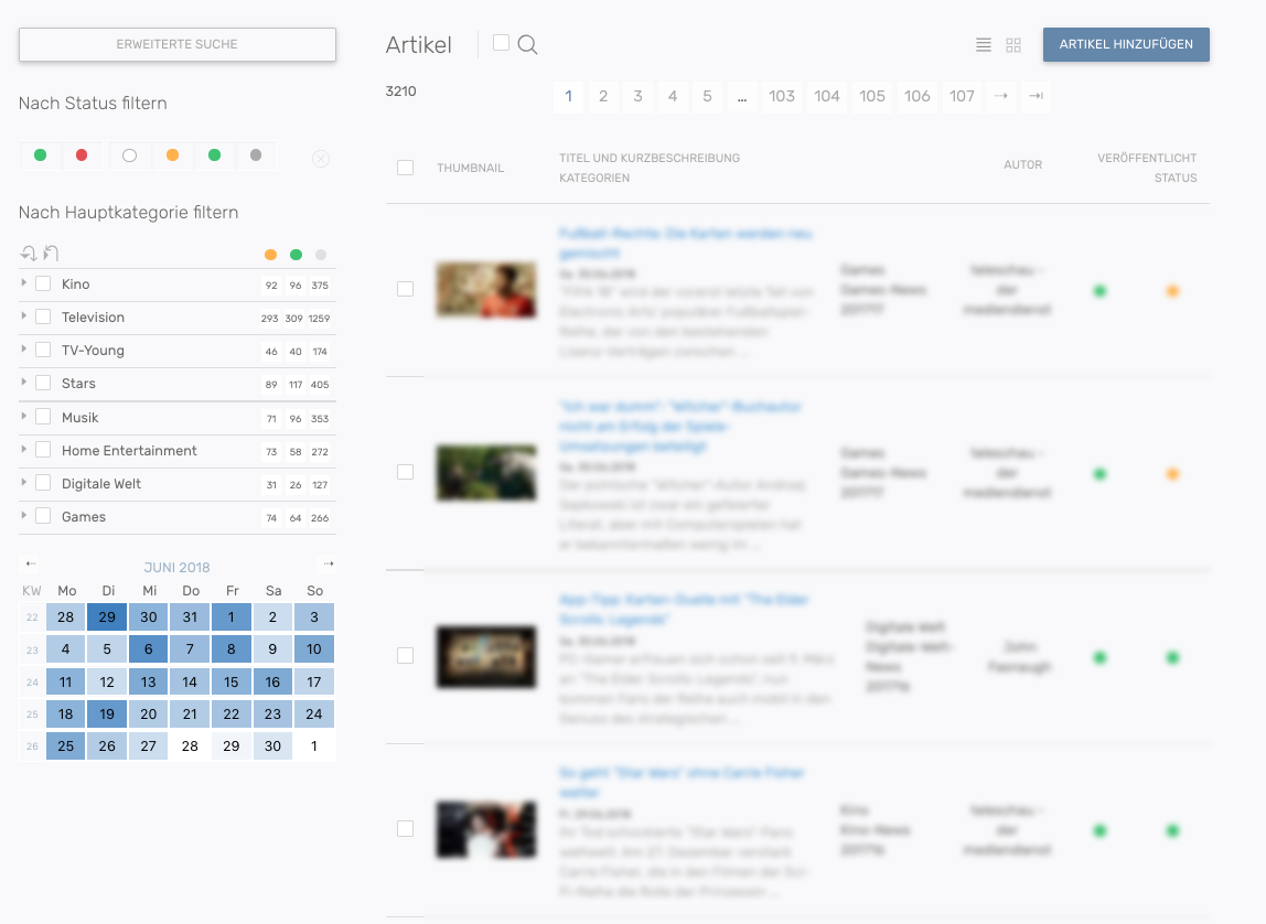 In der Artikelübersicht kann nach Artikeln gesucht, gefiltert und über die Auswahl der durch die Checkbox vor den Artikeln die Artikel veröffentlicht, gelöscht oder dupliziert werden.
