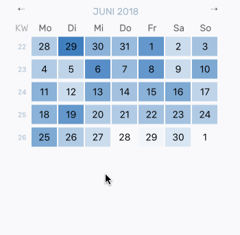 Dieser Filter wird durch Klick auf den jeweiligen Kalendertag aktiviert. Mit einem zweiten Klick auf einen weiteren Kalendertag, erstreckt sich der Filter auf den Zeitbereich zwischen den beiden ausgewählten Kalendertagen. Anschließendes erneutes Klicken auf einen beliebigen Kalendertag führt zu einem neuen Startzeitpunkt des Zeitbereichsfilters.