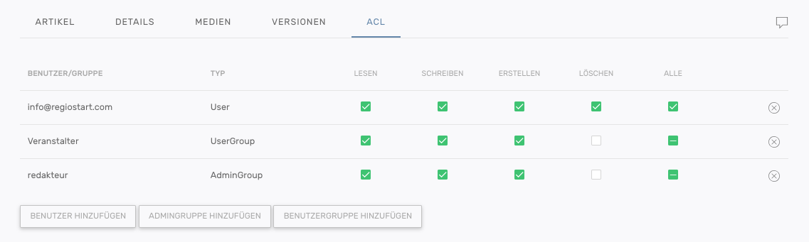 Sonder-Zugriffsberechtigungen des Artikels (ACL)