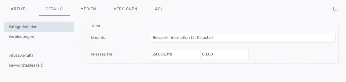 Im DETAILS Tabreiter erscheinen Verbindungen und Kategoriespezifische Felder. Damit Kategoriefelder erscheinen, muss dem Artikel eine Kategorie zugewiesen sein.