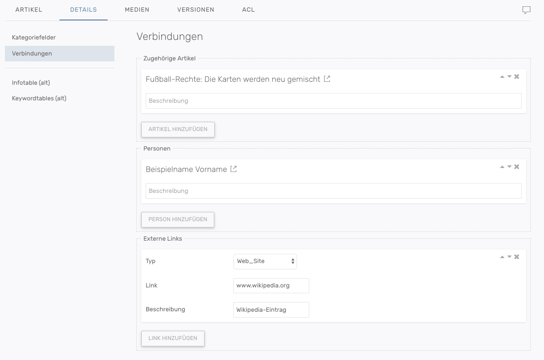 Hier können zudem Artikelverbindungen aus dem Redaktionssystem und Personen aus dem Verzeichnissystem definiert werden.