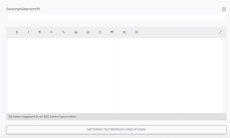 Ein hinzugefügter Textbereich kann über das Löschen-Symbol () bei der Zwischenüberschrift wieder entfernt werden.