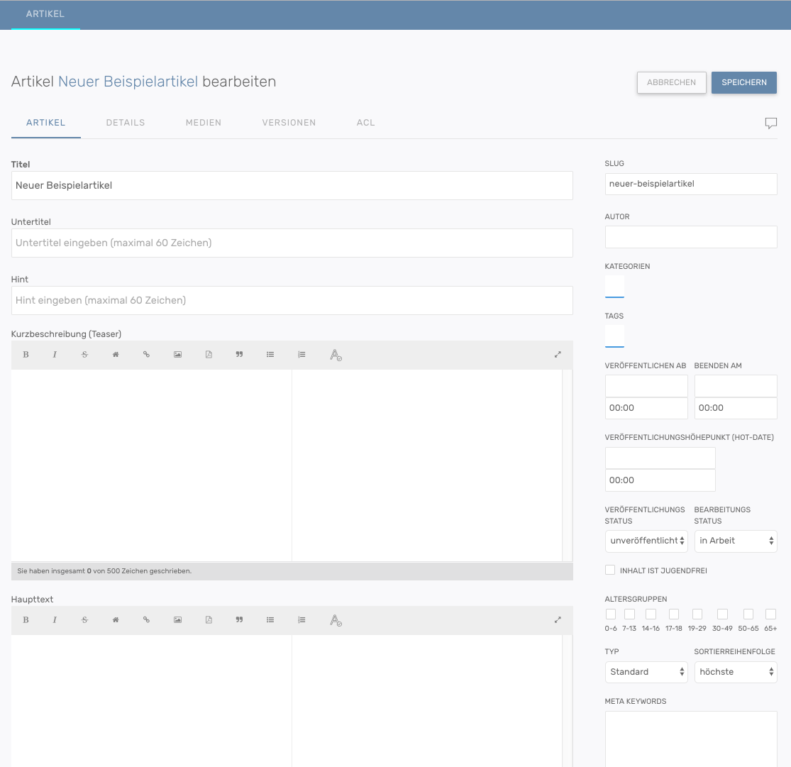 • Veröffentlichungs-Status: ob der Artikel im regulären Frontend angezeigt wird