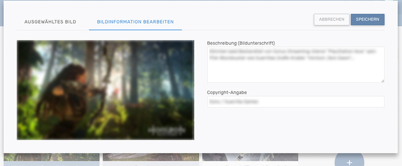 Wenn Sie auf das Bild/Video klicken, erscheint das Dialogfeld zur Zuordnung des Bildes und zur Eingabe der Artikelspezifischen Bildunterschrift und Copyright: