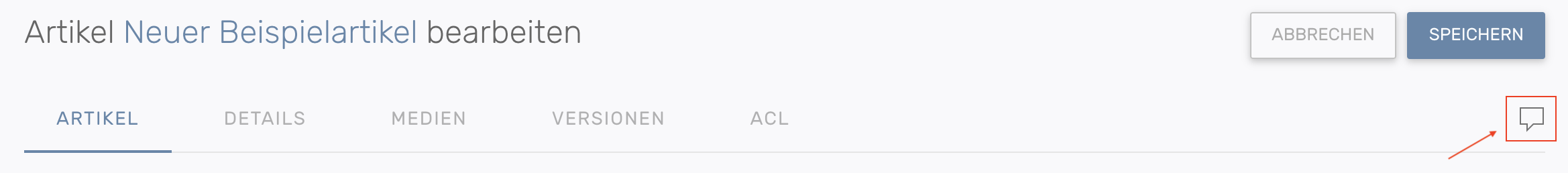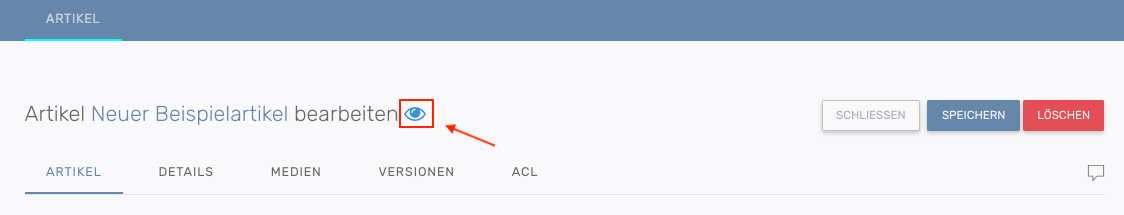 Nach dem Speichern des Artikels erscheint rechts neben dem Titel ein (Augen) Symbol. Durch einen Klick auf das Symbol öffnet sich eine Voransicht des Artikels.