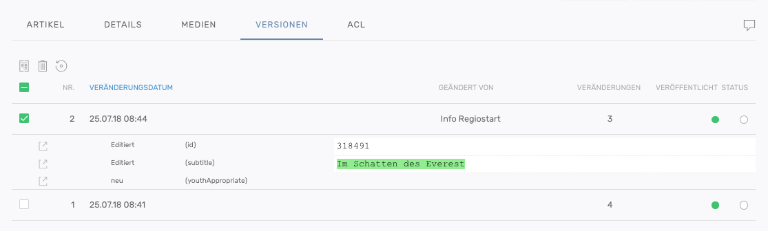 Die Ansicht Versionen zeigt die Änderungen am Artikel, sofern das Logging-System von mozaikoo aktiviert ist.