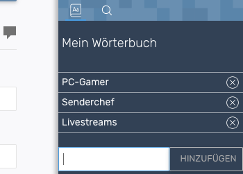Das für jeden Nuzter individuell bestückbare Wörterbuch ermöglicht es neben dem Standartwörterbuch weitere Wörter einzupflegen. Geben Sie hierzu das hinzuzufügende Wort in das Eingabefeld ein. Klicken sich anschließend auf .