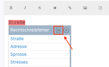 Durch den Klick auf ein rot hinterlegtes Wort, öffnet sich eine Liste mit Wortvorschlägen. Um das Wort dem persönlichen Wörterbuch hinzuzufügen, klicken Sie auf das () Symbol.