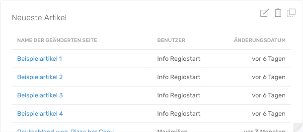 Das Widget zeigt Ihnen eine Liste der neusten Artikel. Mit einem Klick auf den Namen werden Sie zu der entsprechenden Seite navigiert.