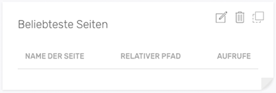 Das Widget zeigt Ihnen die am häufigsten aufgerufenen Seiten im Frontend. Es wird der Seitenname, die URL der Seite und die Anzahl der Aufrufe je Seite angezeigt.