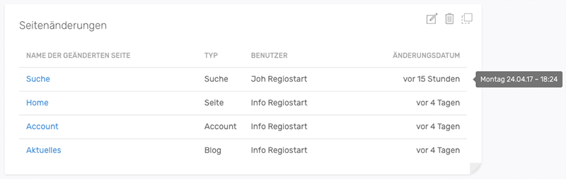 Das Widget zeigt Ihnen die zuletzt geänderten Seiten, deren Seitentyp, den Autor und das relative Datum an. Wenn Sie die Maus über das Datum bewegen, wird die exakte Uhrzeit angezeigt zu der die Seite aktualisiert wurde.
