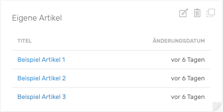 Das Widget zeigt Ihnen eine Liste Ihrer eigenen Artikel. Mit einem Klick auf den Titel des Artikels werden Sie zu der entsprechenden Seite navigiert.