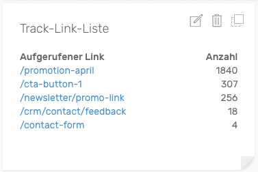 Das Widget zeigt die letzten durch Benutzer im Frontend ausgeführten Links, die mit einer {{track-url}} erstellt wurden.