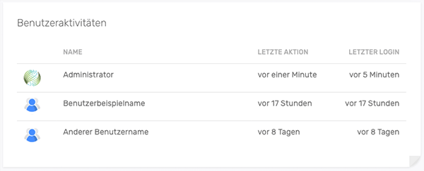Das Widget zeigt Ihnen die letzten Benutzeraktivitäten im Backend an. Welcher Benutzer sich wann zuletzt angemeldet und die letzten Änderungen ausgeführt hat.