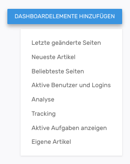 Klicken Sie auf . Es erscheint ein Menü direkt unterhalb des Buttons mit einer Liste der verfügbaren Widgets. Wählen Sie aus der Liste das passende Element aus. Das Widget wird zu Ihrem Dashboard hinzugefügt.