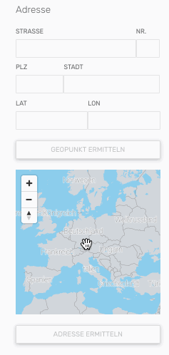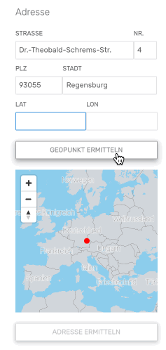 Dabei werden auch gleichzeitig die Geokoordinaten des markierten Standorts ermittelt und zusammen mit der Adresse oberhalb der Karte angezeigt. - geben Sie die Koordinaten manuell ein und klicken unterhalb der Karte auf .