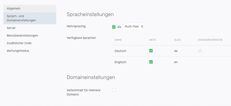 Die verfügbaren Sprachen und die möglichen Domaineinstellungen können nur mit der mozaikoo-Desktopanwendung zur Verfügung gestellt werden. Sprach- und Domainkonfigurationen können auch manuell erstellt werden. Lesen Sie hierzu den entsprechenden Abschnitt in der Developer-Dokumentation.