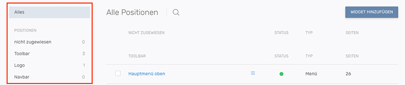 Die Positionsliste dienst auch als Anzeigefilter. Durch Klick auf eine Position, werden nur noch Widgets gezeigt, die an dieser Position zugeordnet sind: