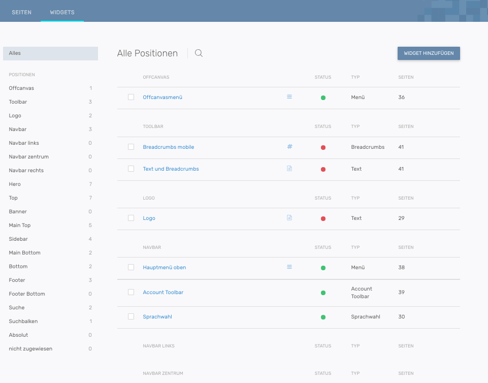 Die Templatepositionen werden in Form einer Liste links neben den angelegten Widgets aufgeführt.