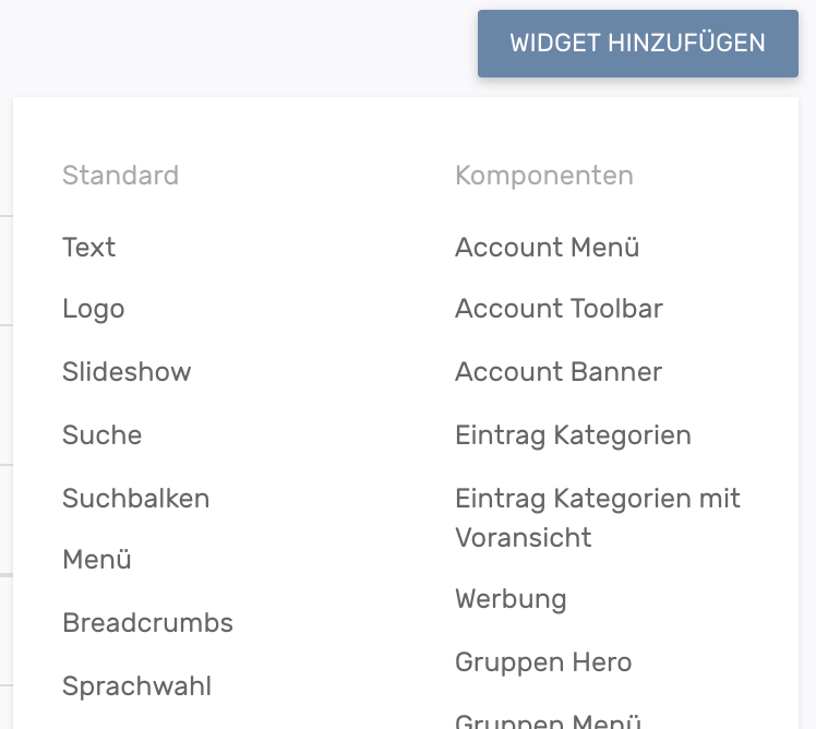 Die Standardtypen sind Text (ein Widget das aus Text oder HTML besteht) sowie spezialisierte Widgets, die entweder ein Menü (Menü), ein Logo (Logo), eine Bildergalerie (Slideshow), einen Suchbalken (Suchbalken), Navigations-Links (Breadcrumbs), eine Sprachauswahl (Sprachwahl) oder ein Suchfeld (Suche) an der entsprechenden Position auswerfen.